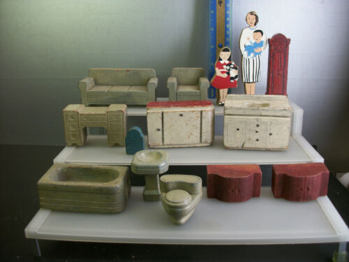 Title (ebay affiliate link): ANTIQUE DOLL HOUSE MINIATURE DOLLS BATHROOM BEDROOM LIVING RM. KITCHEN FURNITURE