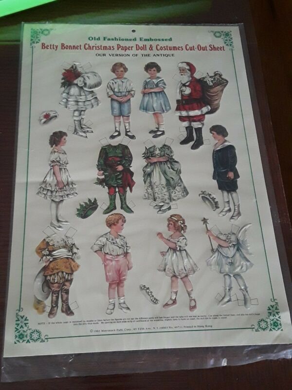 Title (ebay affiliate link): NEW/SEALED Betty Bonnet Christmas Paper Dolls, Embossed Sheet 1985