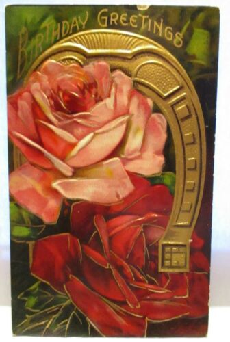Title (ebay affiliate link): 1910 POSTCARD BIRTHDAY GREETINGS, GOLD HORSESHOE AND ROSES