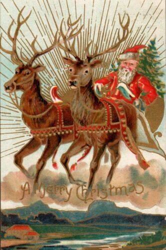 Title (ebay affiliate link): Antique Postcard CHRISTMAS SANTA Flying Reindeer Tree Gold Bells