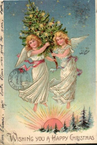 Antique 1906 Postcard CHRISTMAS Two Angels Holding a Decorated Tree