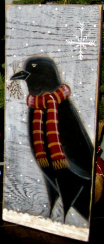 *~*PRIMITIVE*~* HP FOLK ART PRIM WINTER CROW *~* BERRY BRANCHES *~* BOARD