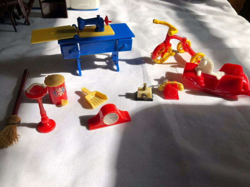 Title (ebay affiliate link): VINTAGE MINIATURE DOLLHOUSE MISCELLANEOUS PIECES, Ash Tray, Clock, Garage Pail +