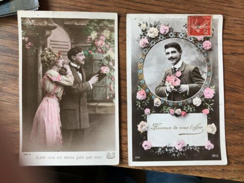 Title (ebay affiliate link): 1909 Hecla and Iris French postcards Romantic Couple messages one stamped