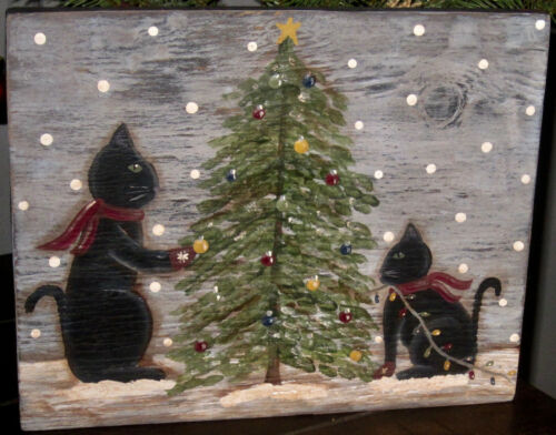 *~*PRIMITIVE*~* HP FOLK ART PRIM WINTER CAT SCENE * TREE * ORNAMENTS *~* BOARD