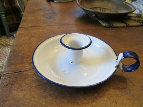 Title (ebay affiliate link): Antique SWEDISH ENAMELWARE CANDLE HOLDER WHITE WITH HANDLE BLUE AND TRIM