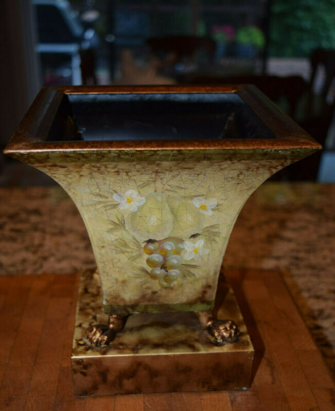 Title (ebay affiliate link): Metal Toleware Tole Cache Pot Paw Feet Base White Grapes EVC Leathered Finish
