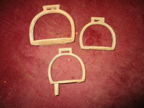 PAIR OF CAST IRON TOY STIRRUPS FOR SALVAGE OR REPURPOSE, PLUS SINGLE LARGER ONE.