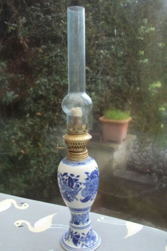 Title (ebay affiliate link): Vintage blue & white oil lamp with glass chimney & wick.