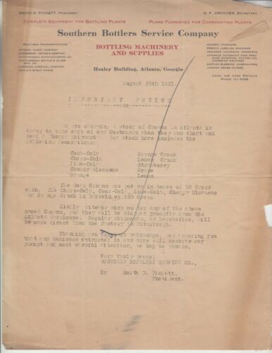 Title (ebay affiliate link): SOUTHERN BOTTLERS SERVICE COMPANY LETTERHEAD DATED AUGUST 21, 1921