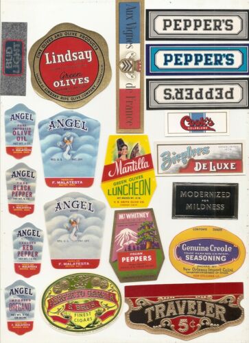 75 Different vintage product Brand Labels ,tuna,olives,spices, soda, beer,etc...