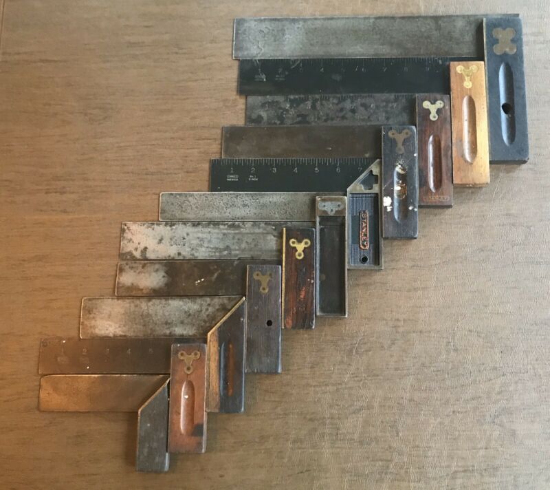Title (ebay affiliate link): Lot 11 Antique Vintage Antique Carpenters Try Squares Stanley Brass Wood Handles