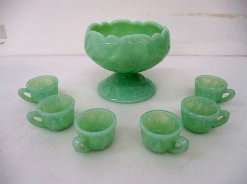 Vtg Jadeite Milk Glass Miniature Punchbowl & 6-Cup Set Cut Strawberry Pattern