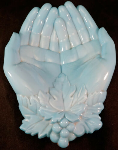 Title (ebay affiliate link): Blue Milk Glass Double Cupped Hands Trinket / Pin Dish Grape & Leaf Design