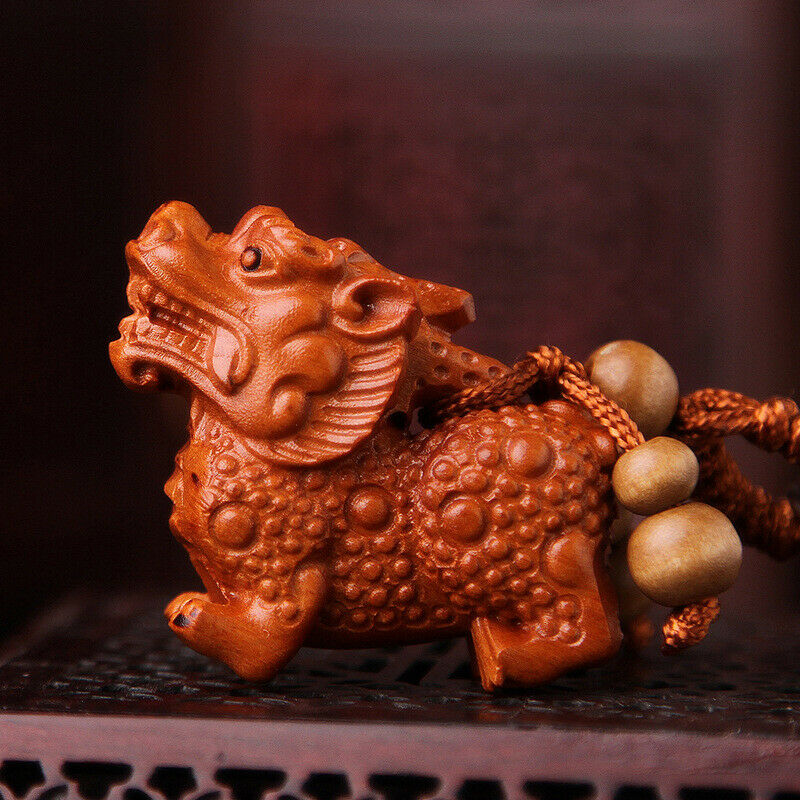 Title (ebay affiliate link): Wood 3D Carving Chinese Wealth Pixiu Pi Yao Statue Pendant Key Chain Dragon