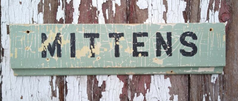 Old early Primitive antique farm chippy Barn wood sign MITTENS winter snow santa