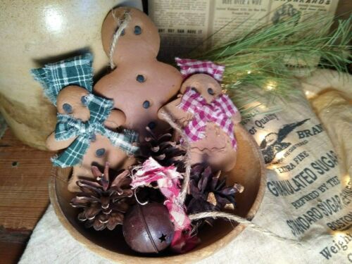 Title (ebay affiliate link): PRIMITIVE VTG WOODEN BOWL + 3 RESIN GINGERBREAD MEN + RUSTY BELL~ CHRISTMAS