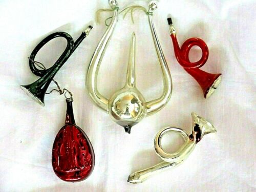 Title (ebay affiliate link): VTG ANTIQUE LOT MERCURY GLASS ORNAMENTS MUSICAL INSTRUMENTS HORNS HARP VIOLIN ?