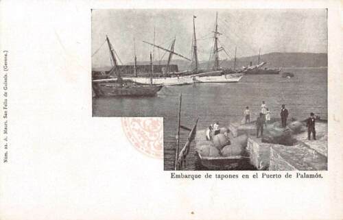 Title (ebay affiliate link): PALAMOS, CATALONIA, SPAIN, HARBOR, WORKERS LOADING TAPONES INTO BOAT c 1898