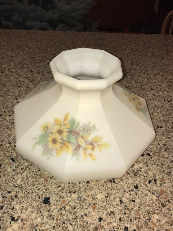 Title (ebay affiliate link): Vintage Aladdin Cream Flowers 10" Round Milk Glass Oil Student Hurricane Shade.