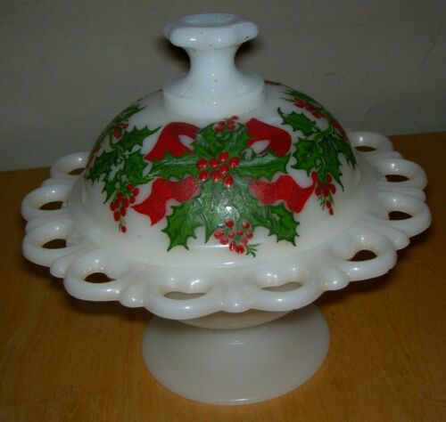 Title (ebay affiliate link): Vintage Milk Glass Fancy-Edge Hand Painted Christmas Pedestal Covered Candy Dish