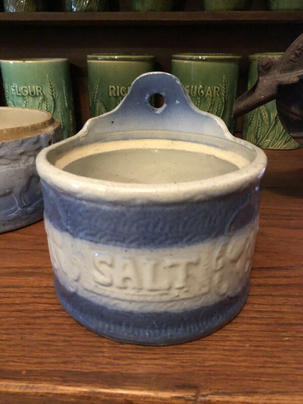 Antique Blue Salt Glazed Stoneware Cherry Pattern Salt Container