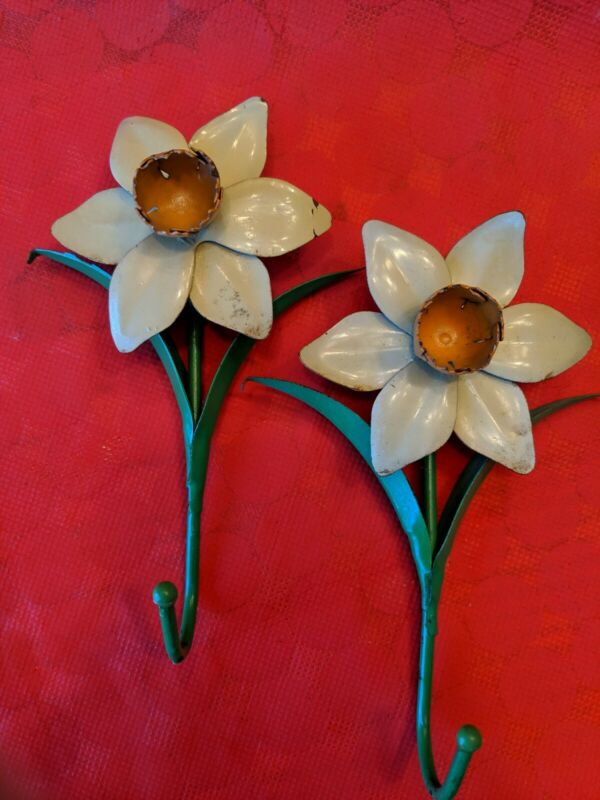 Set Of 2 Vintage Daffodil Decorative Wall Hooks Metal Tole Italy