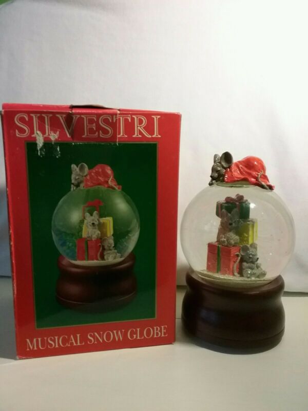 Title (ebay affiliate link): Musical snow globe with box mice, Silvestri, plays White Christmas, pretty