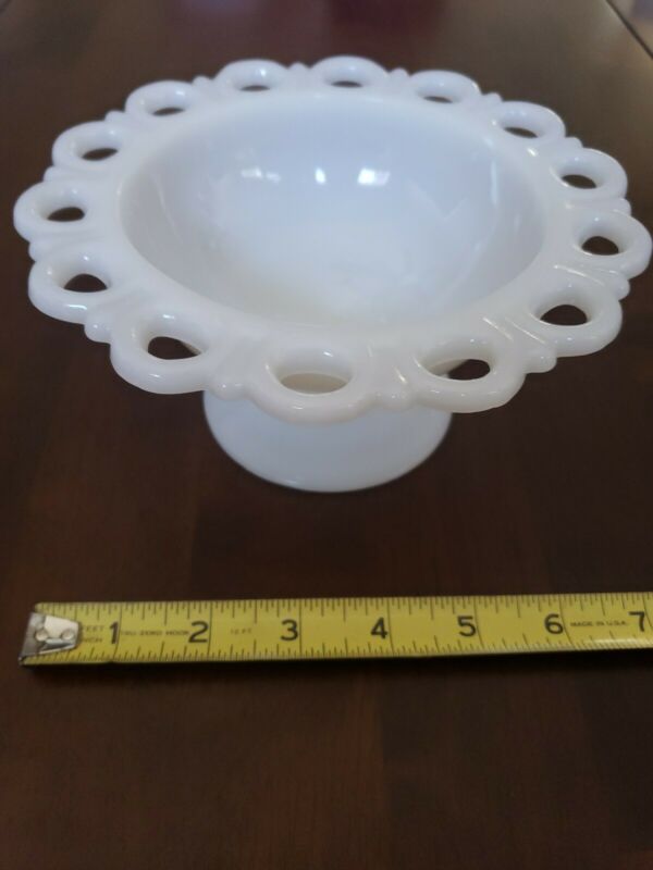 Title (ebay affiliate link): Vintage 7" White Milk Glass Lace Edge Pedestal Footed Candy Dish Compote Bowl