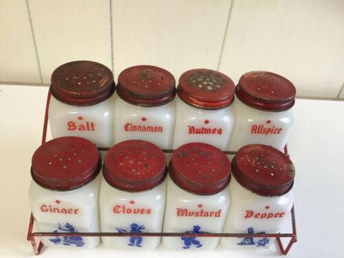 Title (ebay affiliate link): Vintage Dutch Milk Glass Spice 8 Jar Shaker Set Original Rack McKee USA