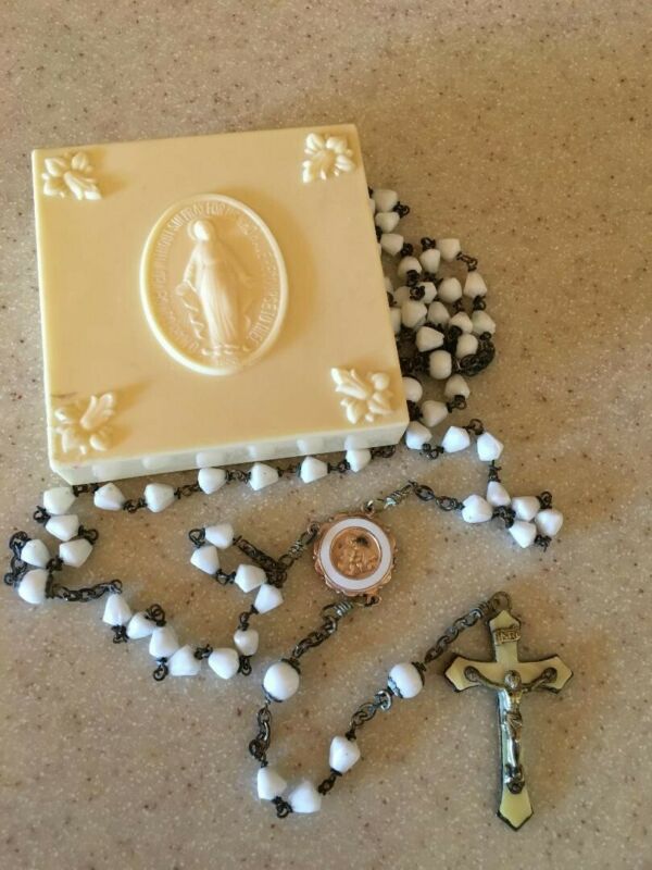 Vintage Milk Glass Rosary First Communion 50s with Case