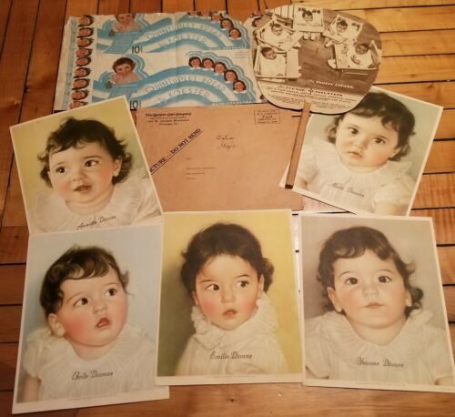 Title (ebay affiliate link): Lot of Dionne Quintuplets Quaker Oats Promo Photos Mailer Fan and Bread Wrapper