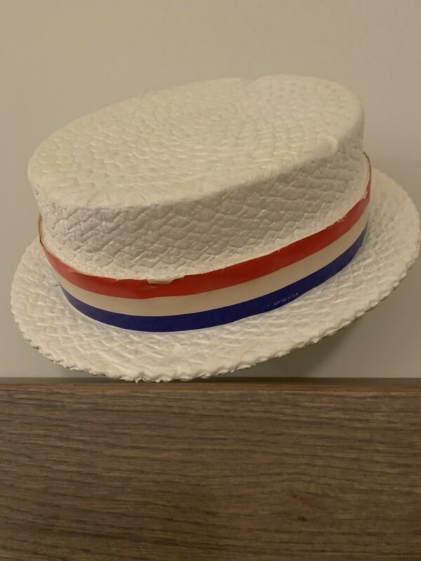 Title (ebay affiliate link): Vintage White Styrofoam Litho USA Campaign Hat w Red, White & Blue Ribbon