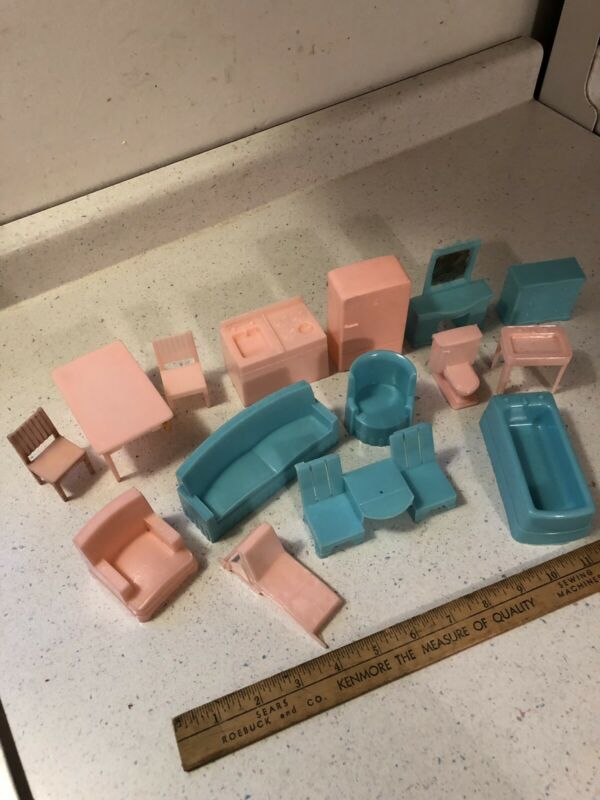 Title (ebay affiliate link): Plastic Pink Blue Vintage Doll House Furniture Kitchen LRm Patio Dresser