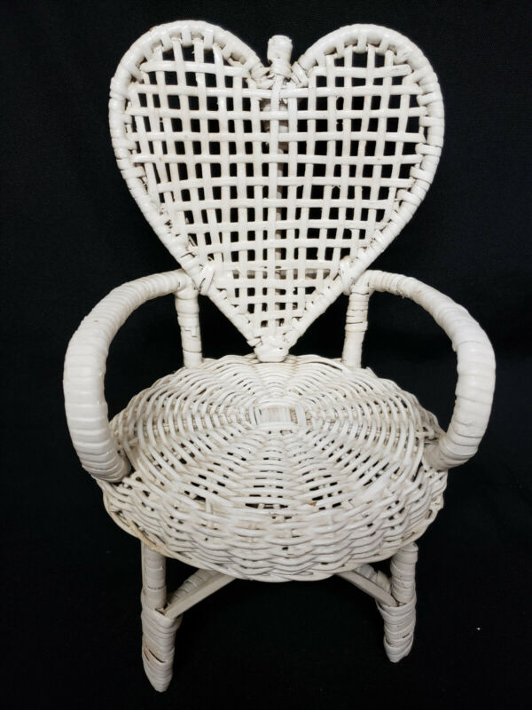 Title (ebay affiliate link): White Wicker Doll Chair Heart Back. 11" H, 7"W, 6"D. Vintage