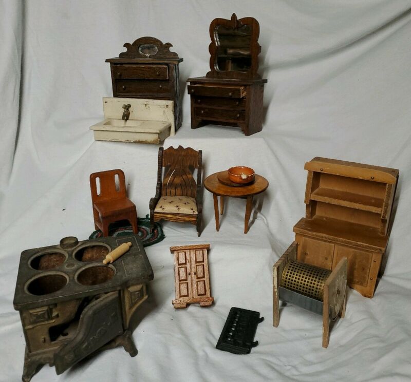 LOT of 10 PIECES of VINTAGE WOOD DOLLHOUSE FURNITURE- custom made