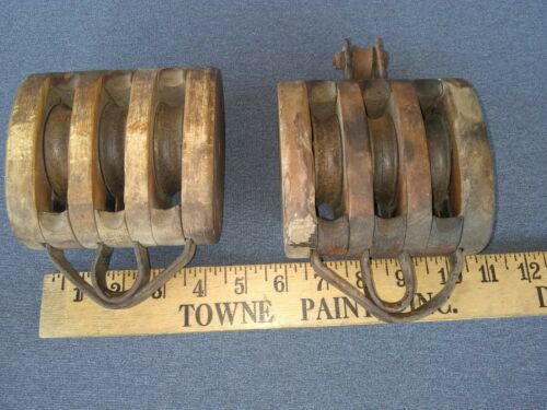 Title (ebay affiliate link): ONE PAIR (2) OF ANTIQUE 3 PART, WOOD AND METAL PULLEYS.