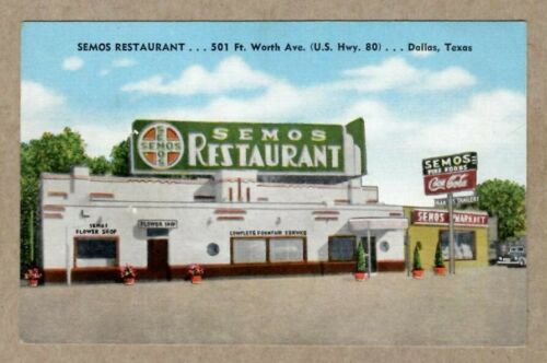 Title (ebay affiliate link): Semos Restaurant, Dallas Texas TX Linen Postcard, Coca-Cola sign, old car
