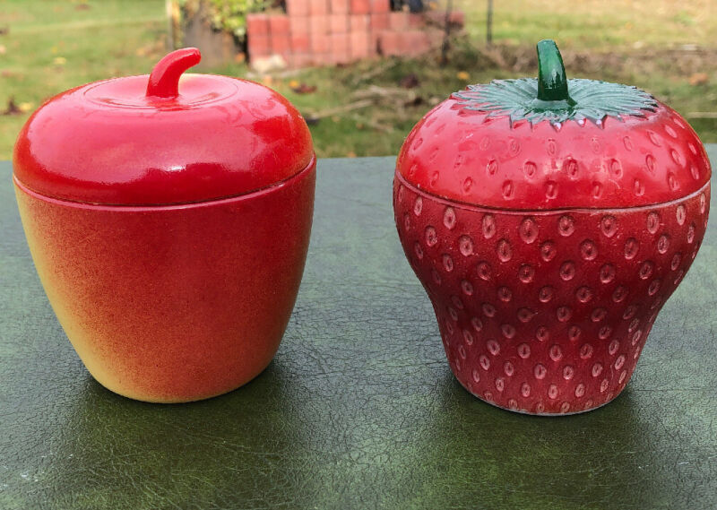 Title (ebay affiliate link): Vintage Hazel Atlas Strawberry & Apple Jelly Jars Painted Platonite Milk Glass