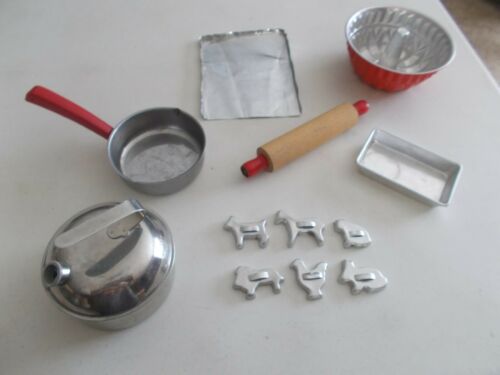 Vintage Toy Kitchenware Pans Childrens rolling pin Aluminum Animal cookie cutte