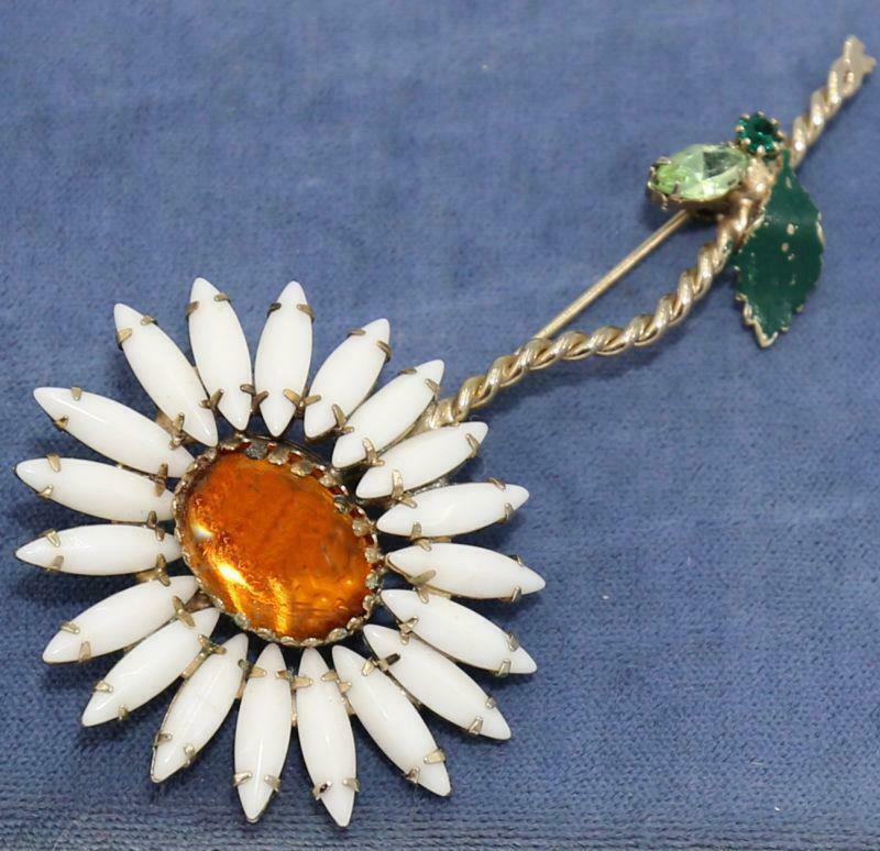 Title (ebay affiliate link): BEAUTIFUL 3 3/4" VTG AMBER CAB MILK GLASS RHINESTONE FLOWER BROOCH PIN! VJ67