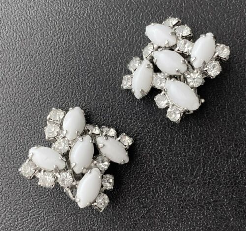 Title (ebay affiliate link): D&E JULIANA Vintage White Milk Glass Crystal Rhinestone Flower Clip Earrings 483
