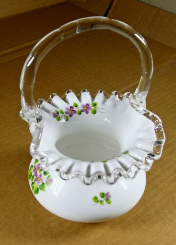 Title (ebay affiliate link): Fenton Milk Glass Silver Crest Fluted Basket Violets In The Snow Pattern