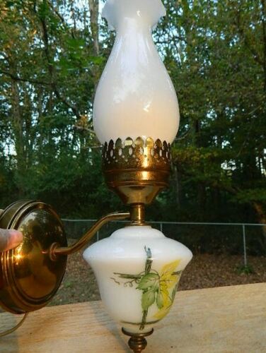 VINTAGE WALL SCONCE LAMP HURRICANE LIGHTING HAND PAINTED TRELLIS MILK GLASS