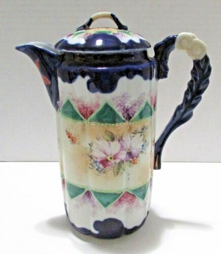 Antique Hand Painted Porcelain Chocolate or Coffee Tea Pot Cobalt Floral Design