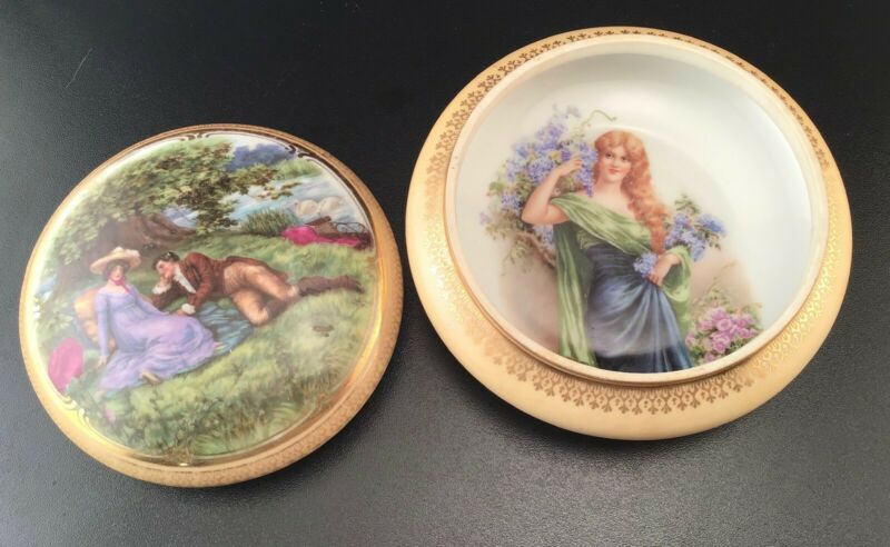 Title (ebay affiliate link): Antique Porcelain Covered Dresser Jar Box Man Woman Courting Gold Hand Painted