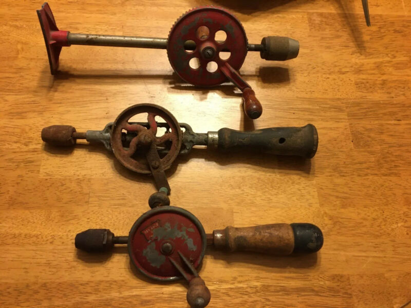 Title (ebay affiliate link): Lot 3 VINTAGE PRIMITIVE HAND CRANK DRILLS TOOL EGG BEATER TYPE