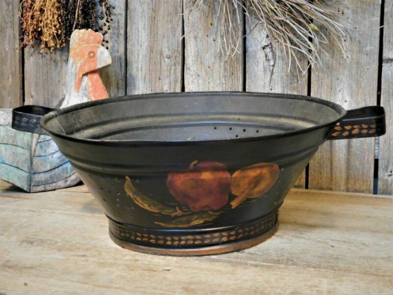 Title (ebay affiliate link): AAFA Antique Primitive Lg Black Tin Strainer Hand Painted Tole Fruit