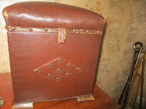 edwardian leather covered lidded storage box/seat brass studs arts/crafts style