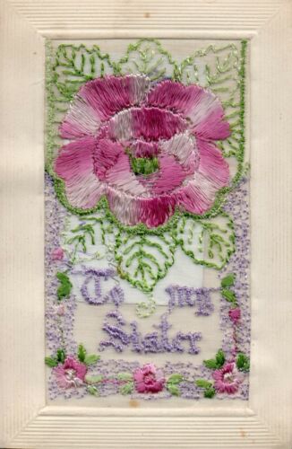 Title (ebay affiliate link): TO MY SISTER: LARGE ROSE & FILIGREE: WW1 EMBROIDERED SILK POSTCARD